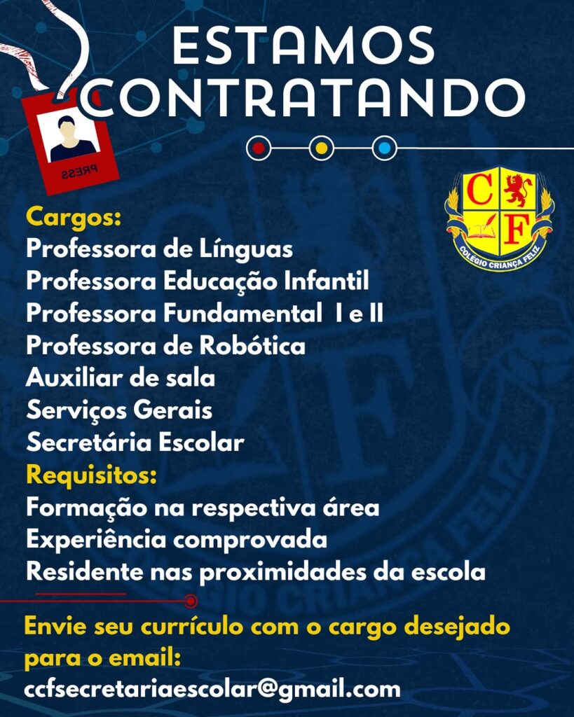 Professor de Língua, Auxiliar de Sala, Secretária Escolar, Professor de Robótica, Professora Educação Infantil, Professor Fundamental