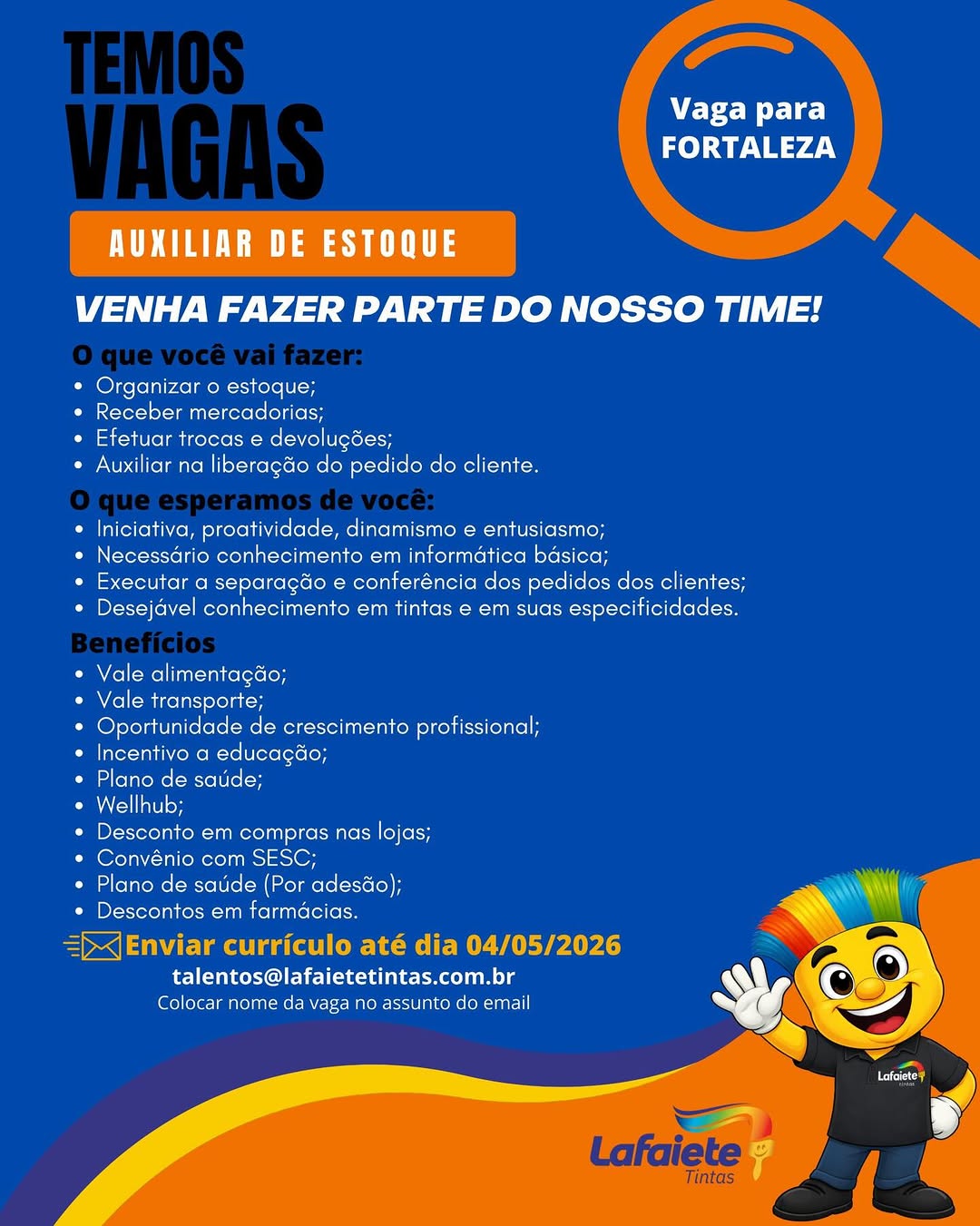 Nós não somos agência de empregos, não cobramos nada, nem antes e nem depois de você conseguir o seu emprego. Não somos nós que realizamos a seleção de currículos, também não realizamos entrevistas. Não nos responsabilizamos pelo envio de currículos. O envio de currículo deverá ser realizado pela pessoa interessada no e-mail que estiver na vaga.