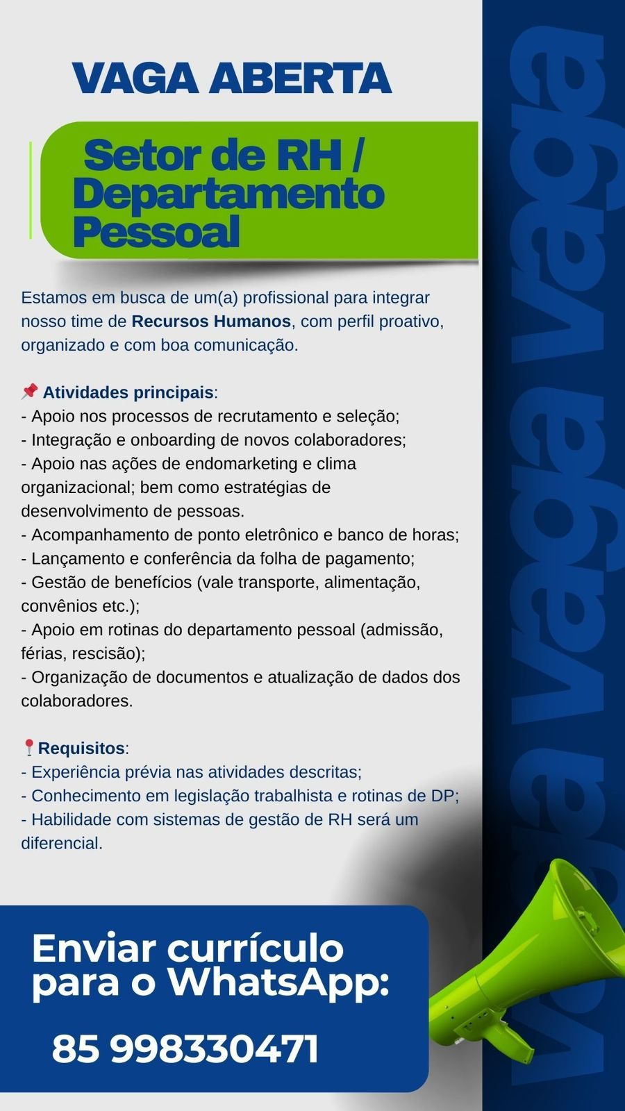 As vagas são divulgadas da mesma forma que recebemos. Não nos responsabilizamos pelas vagas, nem pelas informações fornecidas referente as mesmas, também não nos responsabilizamos pela idoneidade das empresas e instituições, apenas divulgamos as vagas que recebemos. Alertamos à buscar informações sobre as empresas que estão disponibilizando as vagas, através de contato por telefone ou e-mail divulgados nas mesmas, além de pesquisar na internet ou outros meios. Tome muito cuidado com locais (empresas ou instituições) que cobram taxas para garantir vagas ou para garantir uma colocação no mercado de trabalho. Esteja atento (a) a localização (endereço) da entrevista e do local de trabalho, se não conhecer ou achar que é um lugar isolado, vá com uma companhia ou não vá. Ter um emprego para garantir seu sustento e de sua família é importante, mas sua segurança e integridade também é, por isso, esteja atento. Se você é menor de idade vá acompanhado (a) de um (a) responsável.