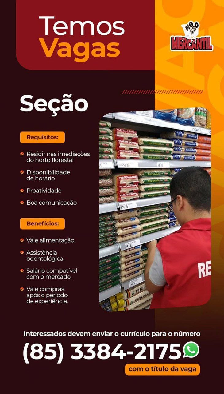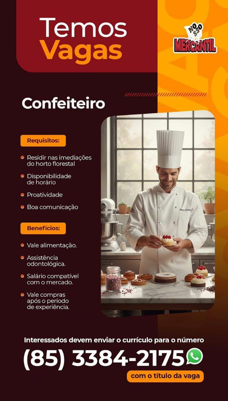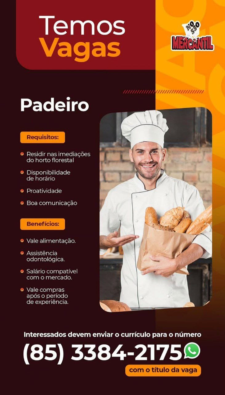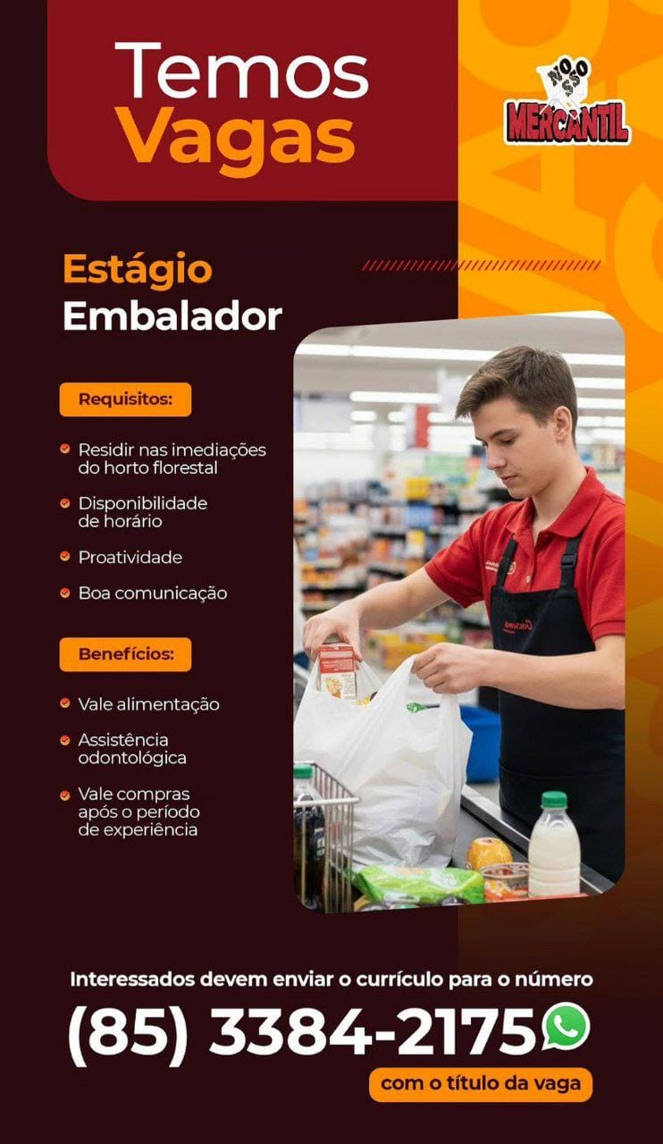 Vagas em Maracanaú para Embalador, Repositor de FLV, Repositor de Frios, Confeiteiro, Recepcionista, Padeiro, Operador de Caixa, Atendente de WhatsApp
