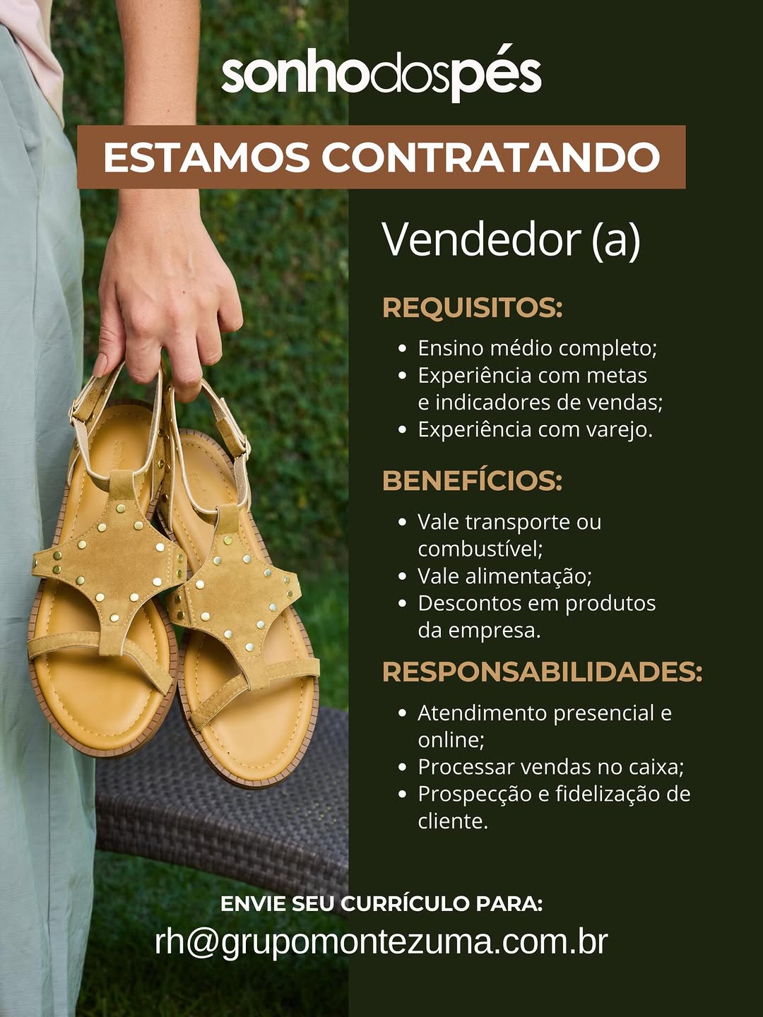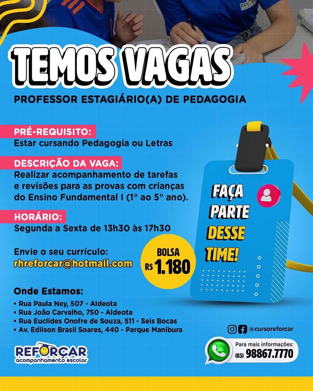 Nós não somos agência de empregos, não cobramos nada, nem antes e nem depois de você conseguir o seu emprego. Não somos nós que realizamos a seleção de currículos, também não realizamos entrevistas. Não nos responsabilizamos pelo envio de currículos. O envio de currículo deverá ser realizado pela pessoa interessada no e-mail que estiver na vaga.