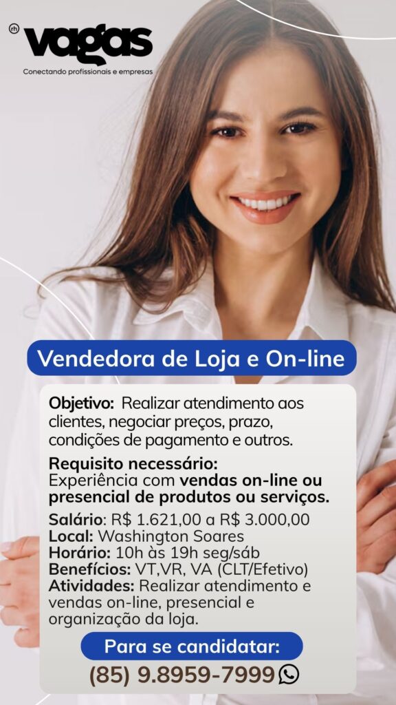 Necessário ter experiência com vendas presencial ou on-line.